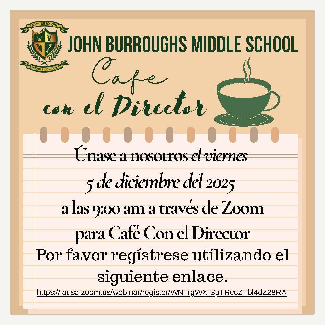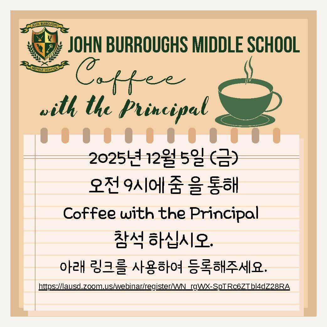 Join us for Coffee with the Principal via Zoom Friday, December 5, 2025 at 9AM Please register using the following link: https://lausd.zoom.us/webinar/register/WN_39pXxFmRQeuzZ7nQvx-oDw Attached Files 2025_12_05_CWP_ENG.pdf 2025_12_05_CWP_SPN.pdf 2025_12_05_CWP_KOR.pdf